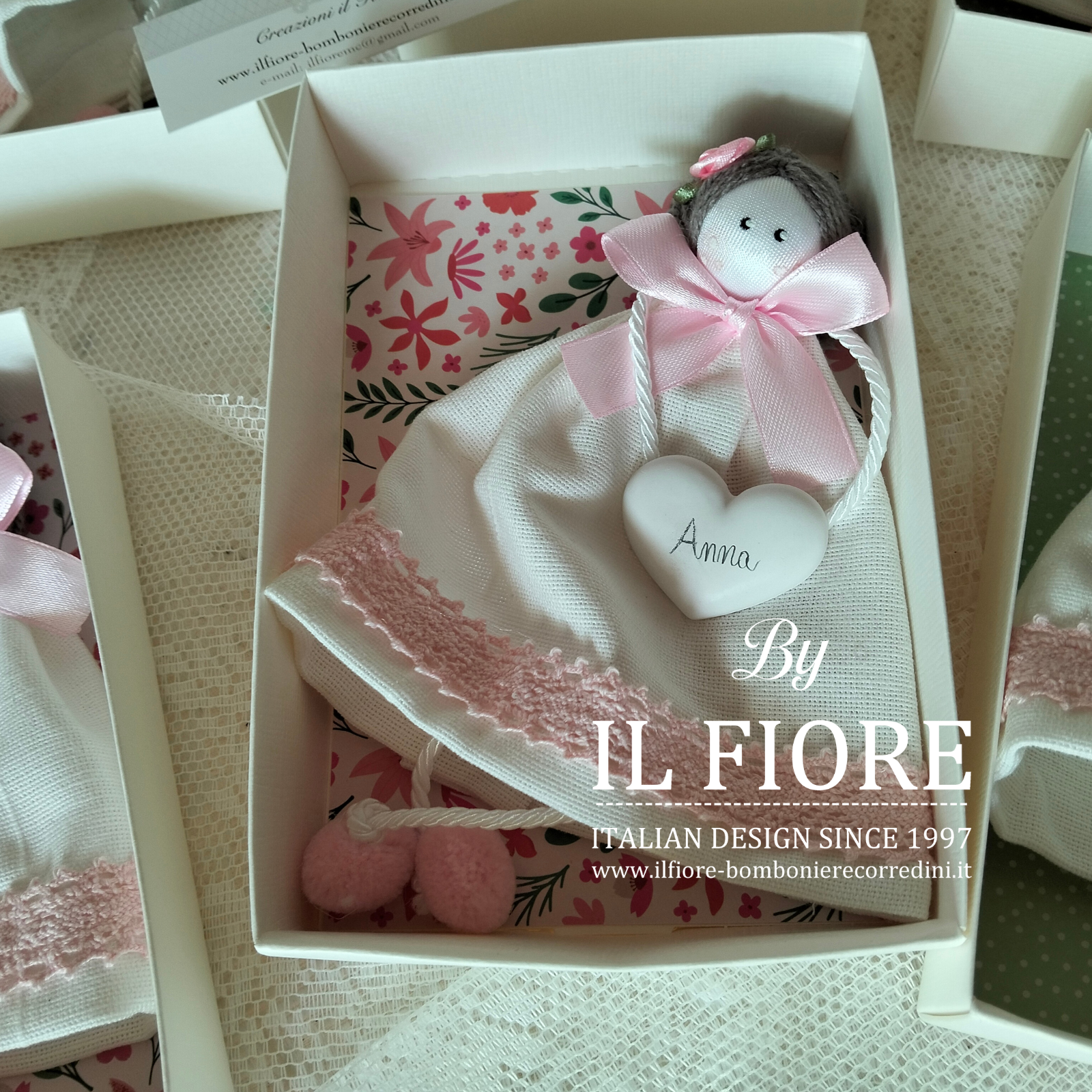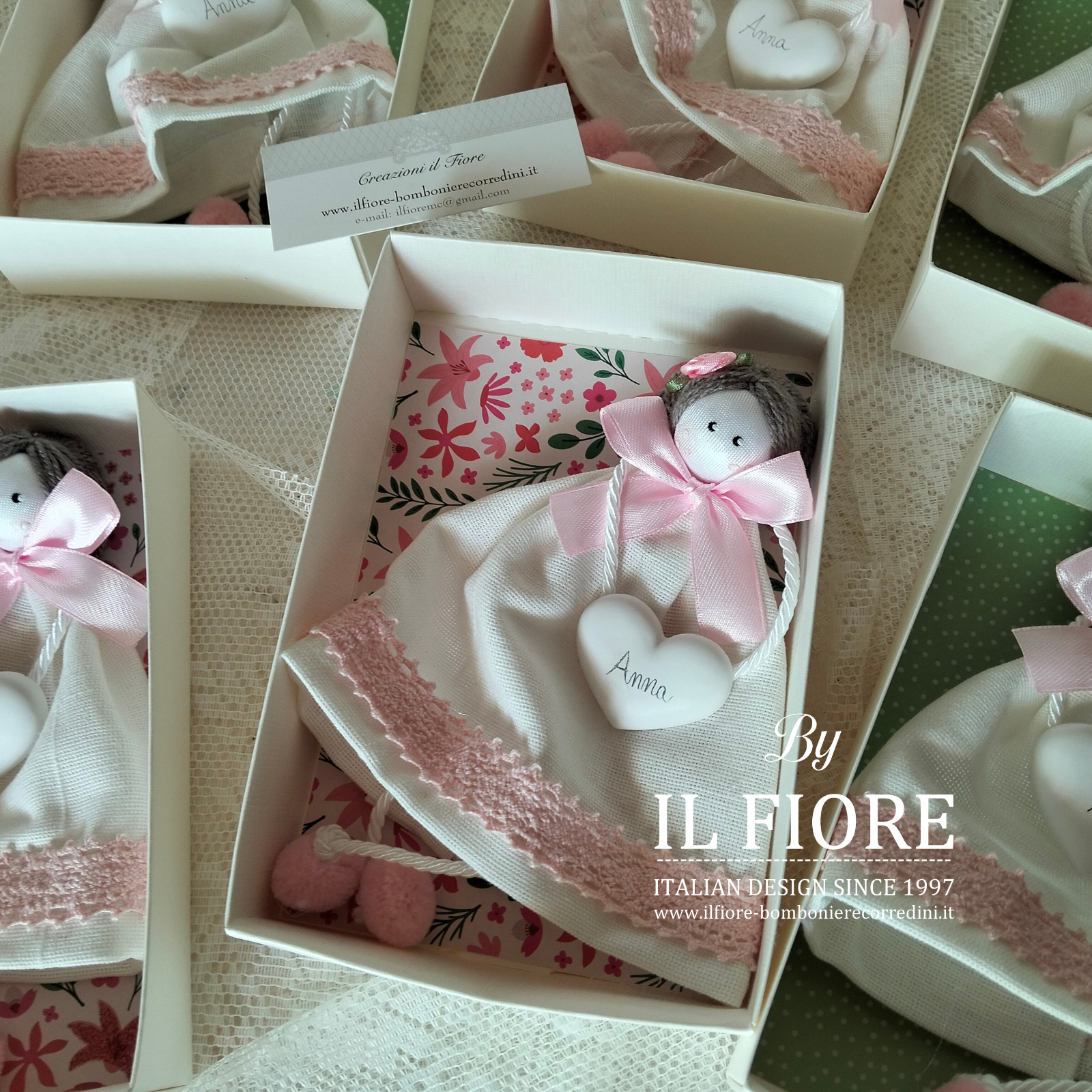 Bomboniera bambola con vestito e cuore personalizzabile con nome, ideale per Comunione e Cresima. Confezionata con busta , tag personalizzata con nome e data cerimonia.