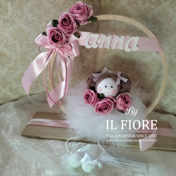 Cerchio Comunione e Cresima con bambola e vestito in tulle con fiori e nome.