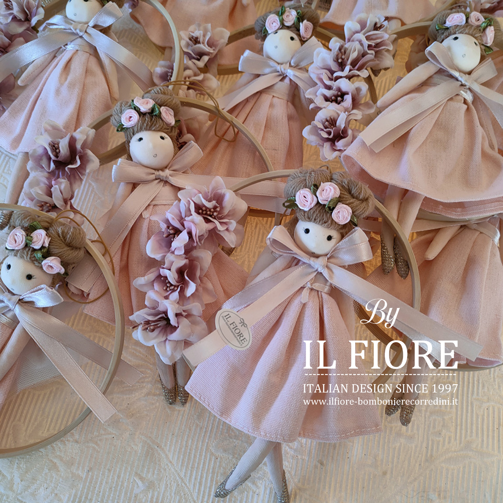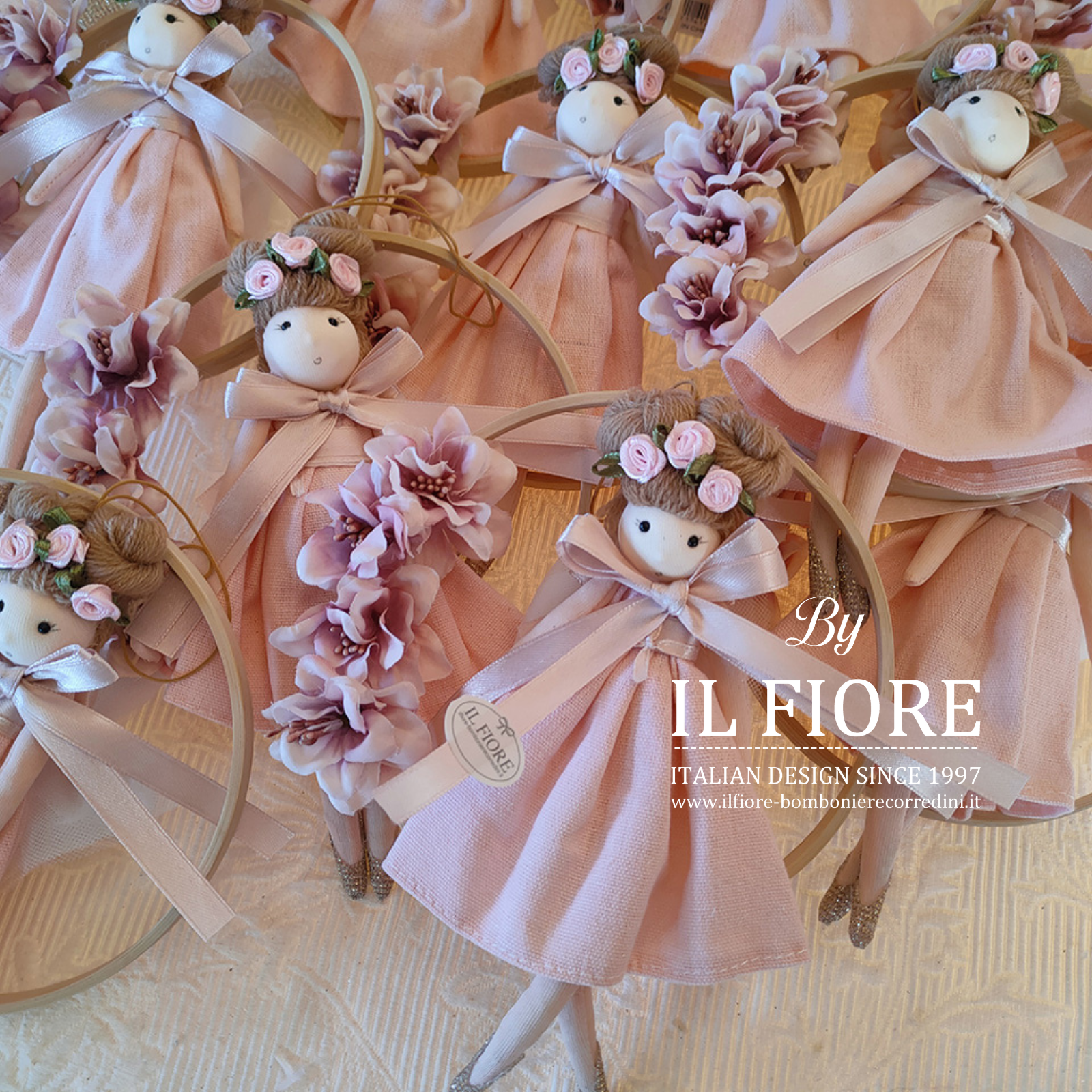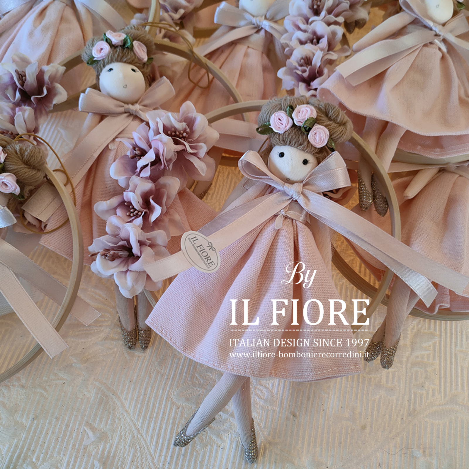 Bomboniera Cresima e Comunione bambola nuvola con vestito rosa e bianco, decorata con fiori e cerchio.