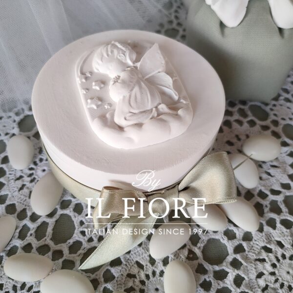 Bomboniera Comunione e Cresima, scatola in gesso profumatissimo, oltre ad essere un capiente portagioie ha all’interno anche una candela, decorato con angioletto in gesso profumato e nastro.