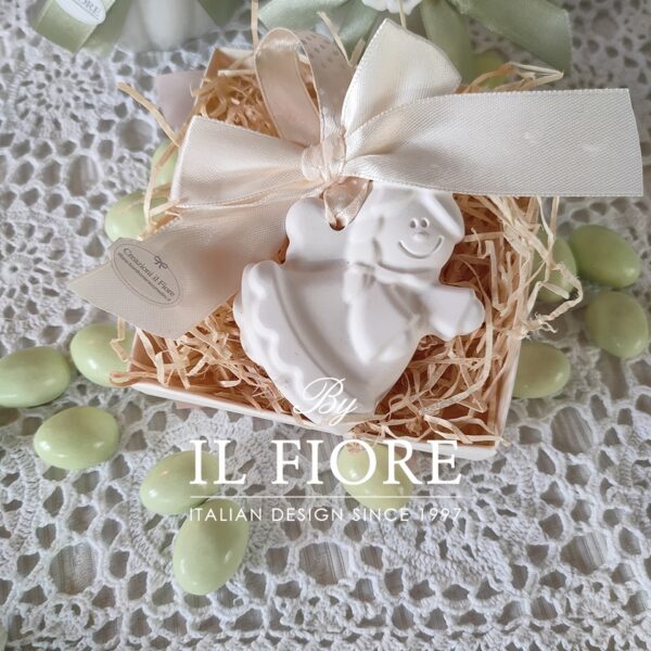 Bomboniera Comunione e Cresima, angelo bimba in gesso profumato, confezione con scatola, tag e fiocco. Un dolcissimo ricordo profumato.