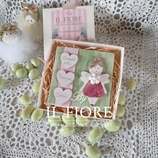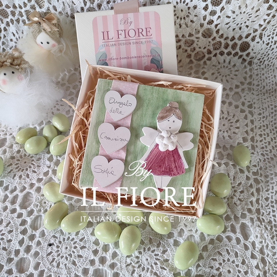 Bomboniera Comunione e Cresima, mattonella in gesso profumato con angelo, dedica e personalizzata con nome, confezione con scatola decorata tag e nastro.