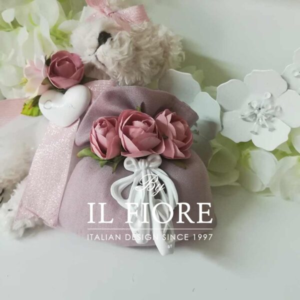 Bomboniera Comunione bimba, bomboniera Cresima bimba. Raffinato sacchetto portaconfetti con ballerine danza in gesso profumatissimo, fiori. Ideale come bomboniera bimba per Comunione e Cresima.