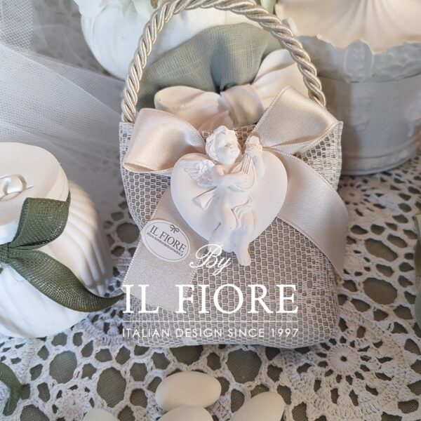 Bomboniera Comunione e Cresima, borsetta sacchetto portaconfetti con angelo in gesso profumato.