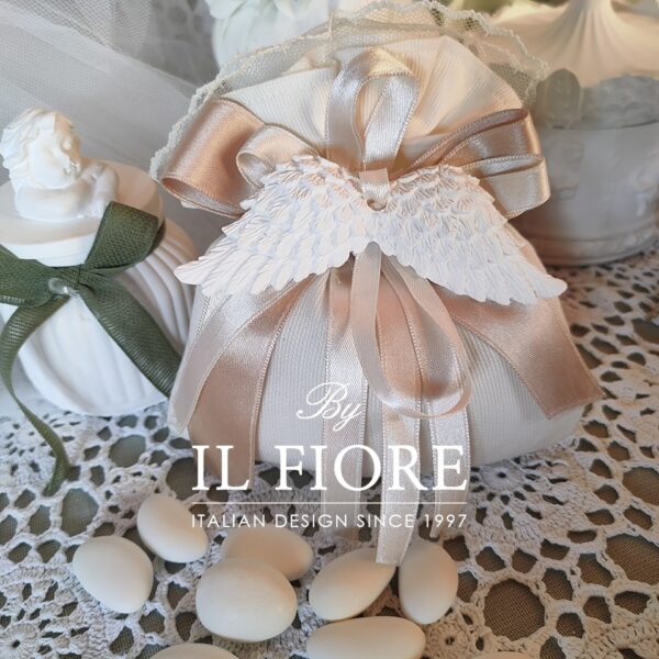 Bomboniera Comunione e Cresima, sacchetto portaconfetti con ali di angelo in gesso profumato.