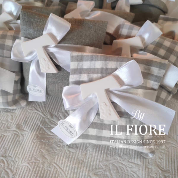 Bomboniera Comunione e Cresima sacchetto portaconfetti a quadri e tinta unita con Tao in gesso e calamita.