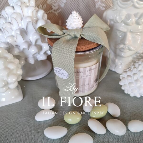 Bomboniera Comunione e Cresima candela barattolo di vetro con coperchio decorato con pigna in gesso, fiocco, tag personalizzata con nome e data cerimonia.