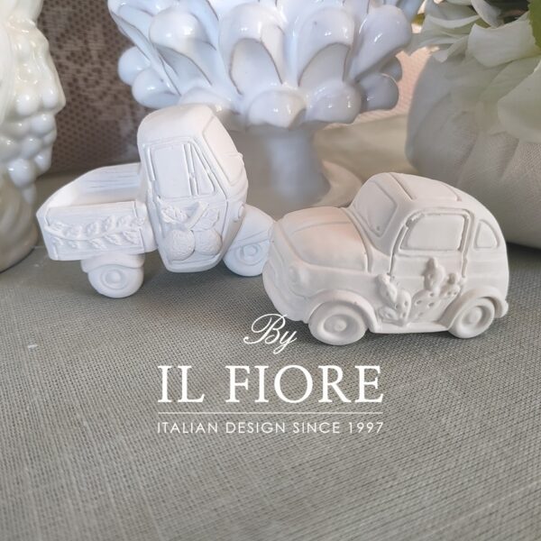 Bomboniera Comunione e Cresima, cinquecento e ape siciliana in gesso profumato con calamita, confezione con scatola, tag con nomi sposi e data cerimonia e fiocco.