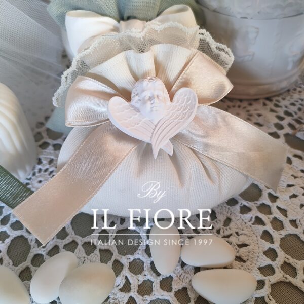 Bomboniera Comunione e Cresima, sacchetto portaconfetti con angioletto in gesso profumato.