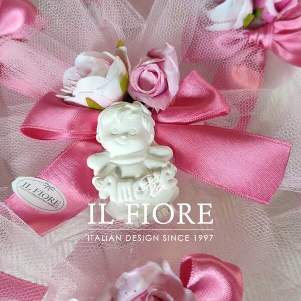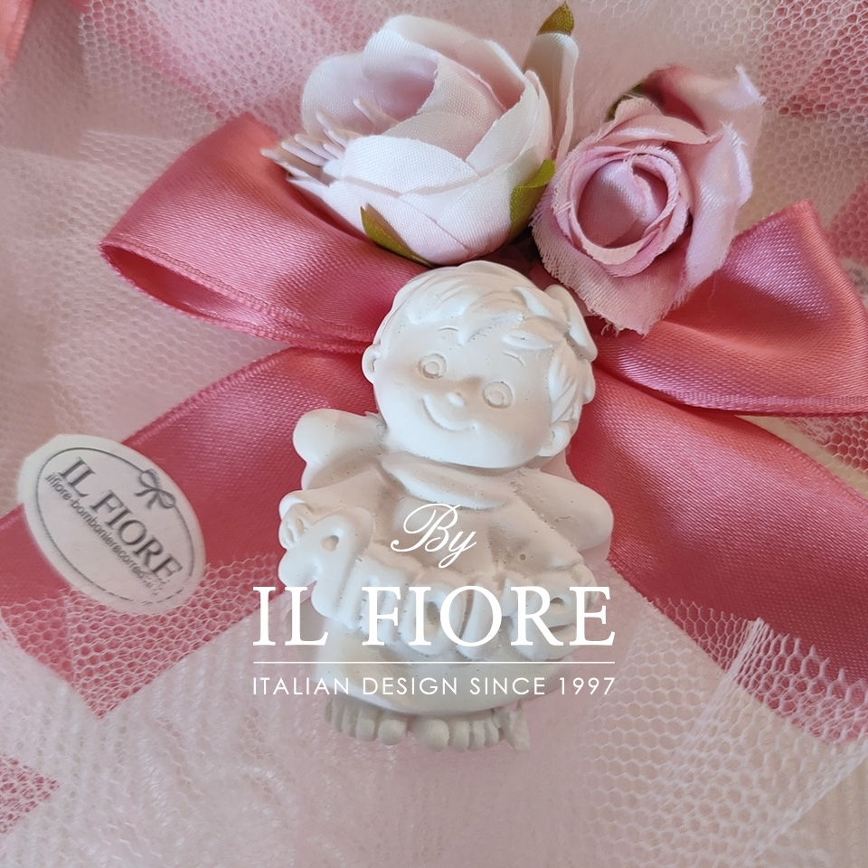 Bomboniera Comunione e Cresima, ciuffetto in tulle con angioletto in gesso profumato amore, sogni e gioia con nastro.