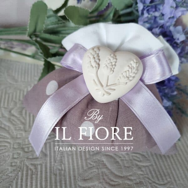 Bomboniera Comunione, Cresima, matrimonio e anniversario matrimonio, sacchetto portaconfetti provenzale in cotone di colore glicine a pois e bianco, decorata con gessetto profumato cuore con decorazione lavanda, nastro di raso colore glicine.