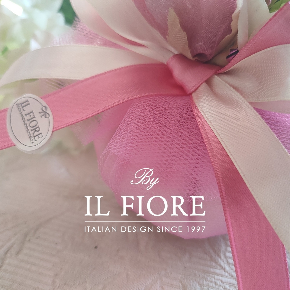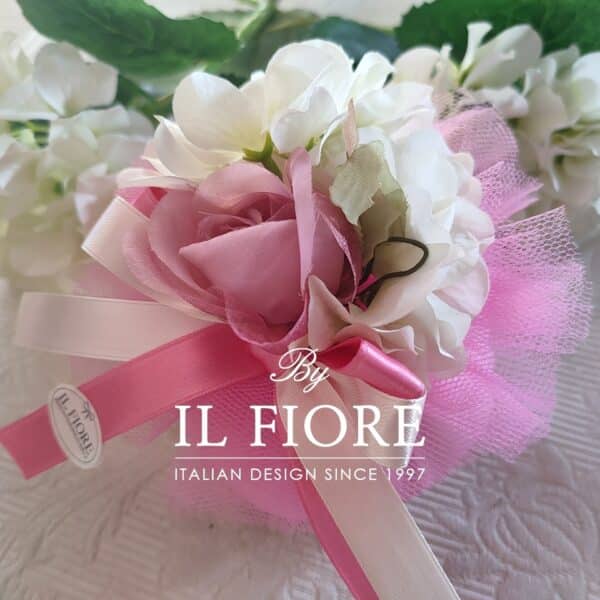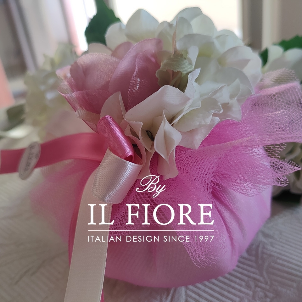 Bomboniera bon bon grande di colore fuxcsia, esclusiva e romantica ricca di fiori consigliata come bomboniera Comunione e Cresima.