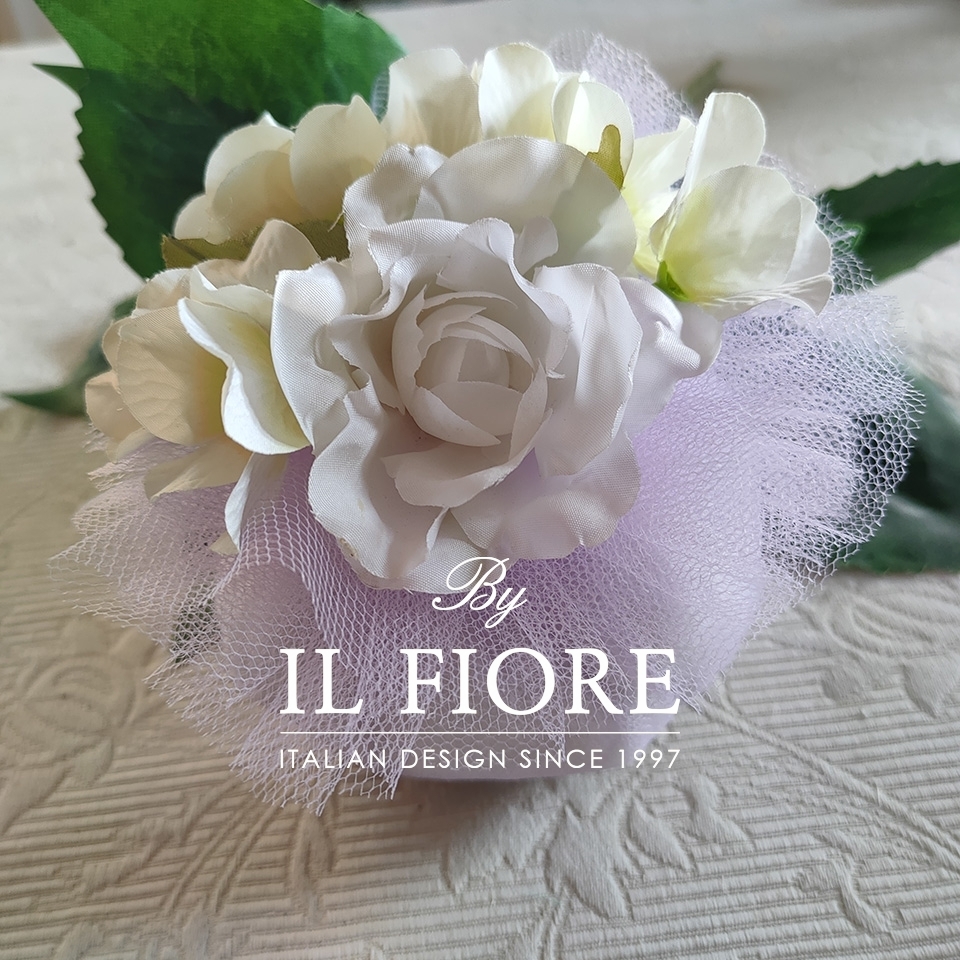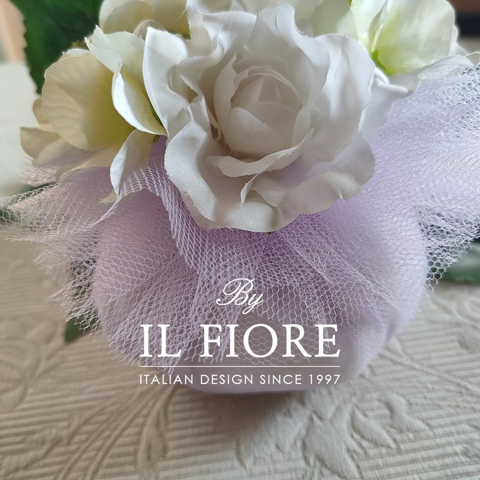 Bomboniera bon bon grande di colore glicine, esclusiva e romantica ricca di fiori consigliata come bomboniera Comunione e Cresima.