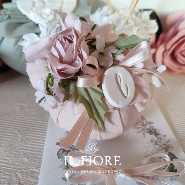 Bomboniera bon bon rosa cipria, esclusiva e romantica ricca di fiori e pot pourri profumatissimo. Una realizzazione elegante, originale, esclusiva e profumata con medaglione personalizzato con lettera.