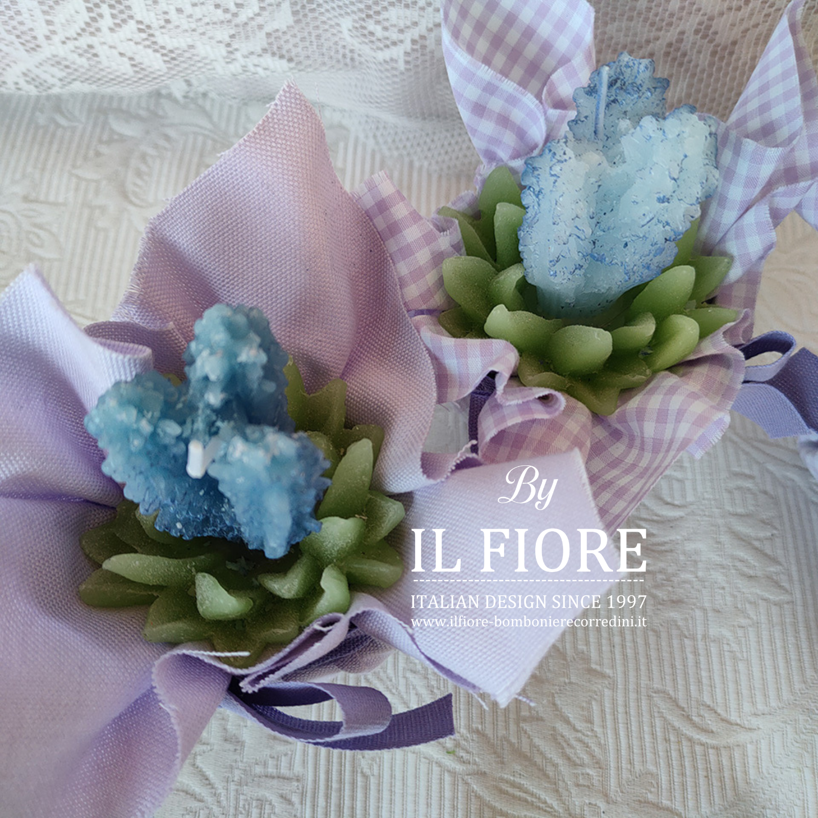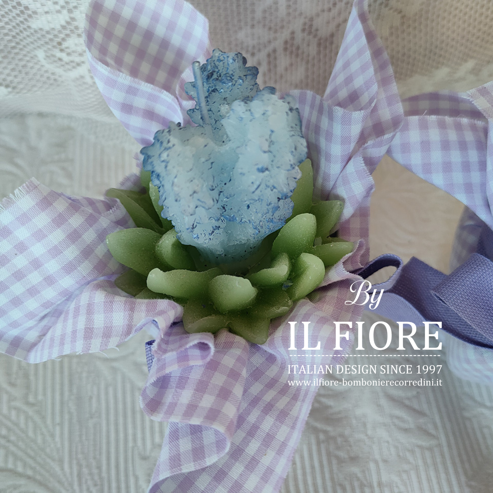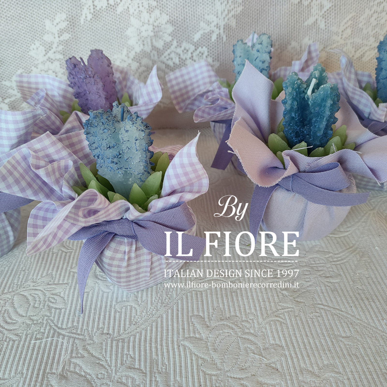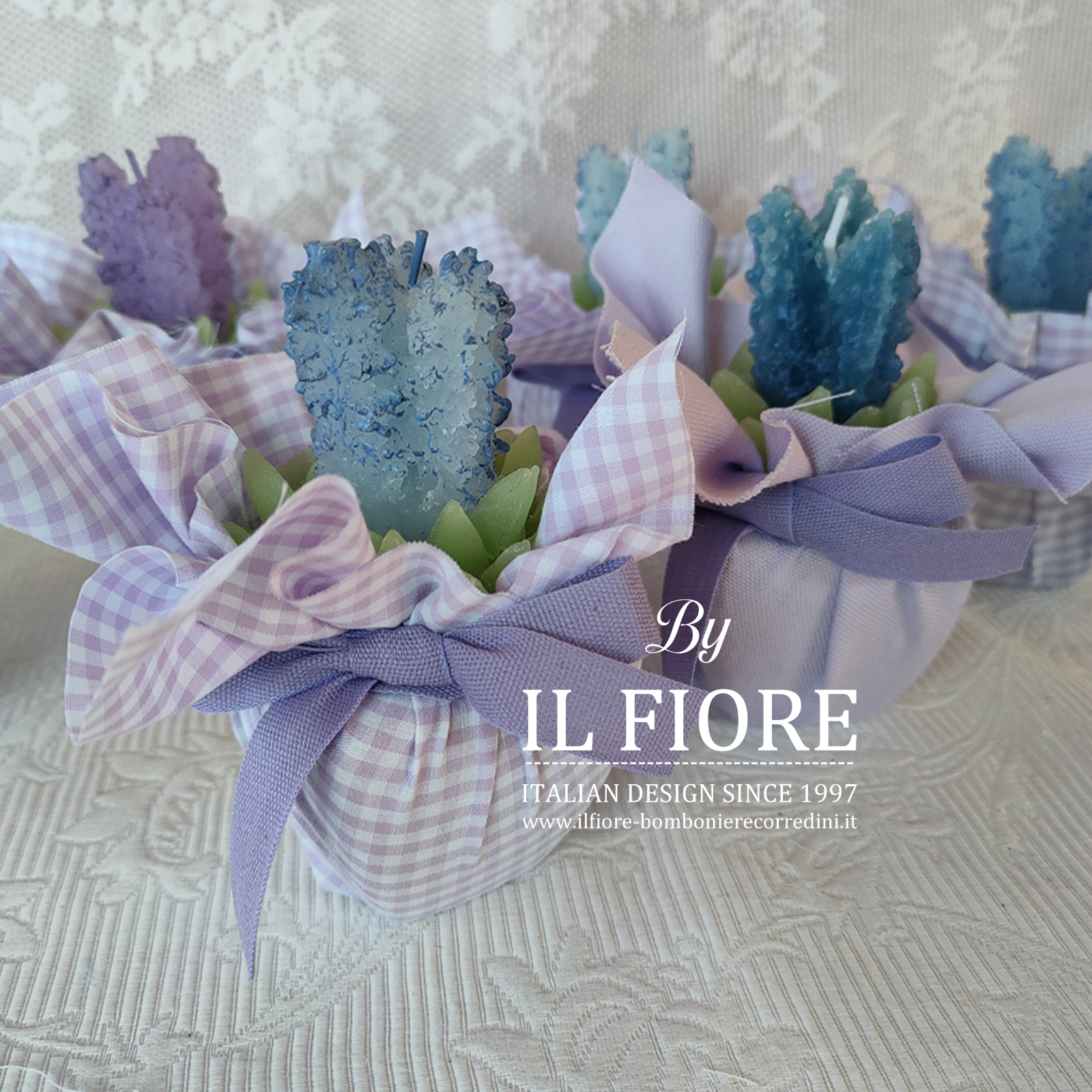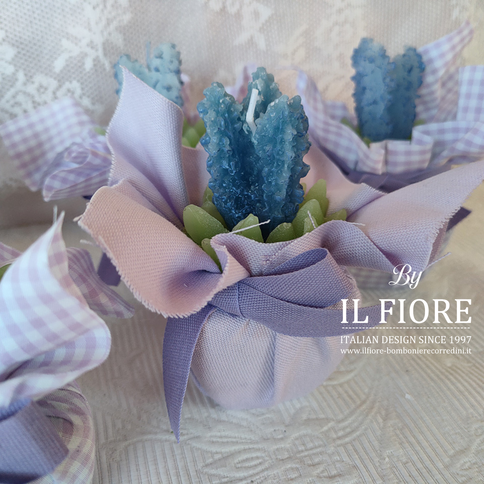 Bomboniera candela lavanda per Comunione e Cresima, la bomboniera sarà confezionata con due tessuti.