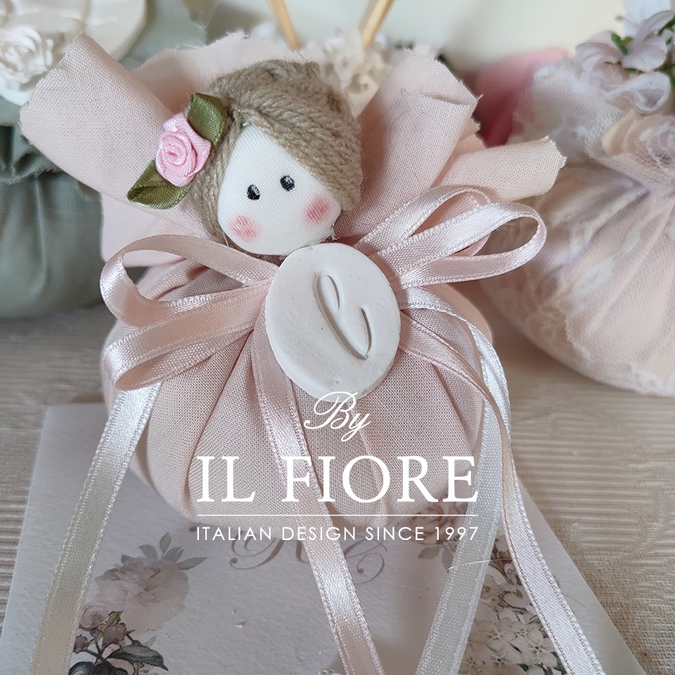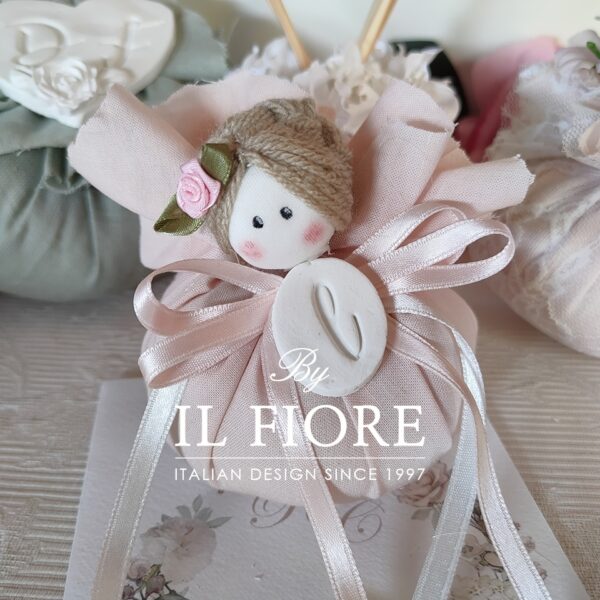 Bomboniera ciuffetto con testa bambolina e lettera personalizzabile per Comunione e Cresima.