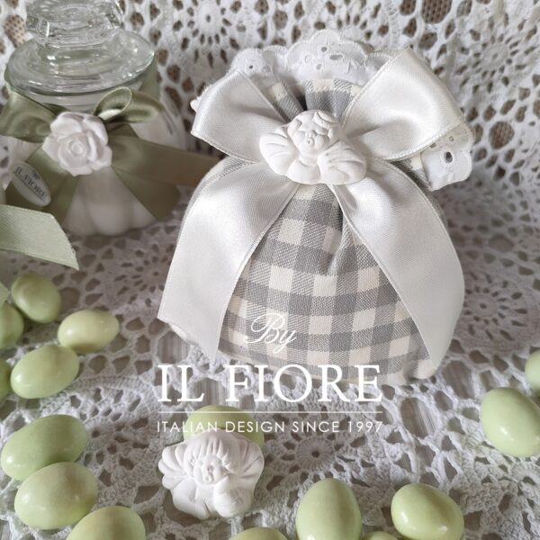 Bomboniera Comunione e Cresima, sacchetto a quadri con merletto in Sangallo e angelo in gesso profumato e nastri.