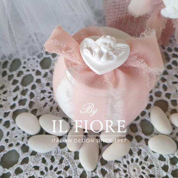 Bomboniera Comunione e Cresima, scatola in gesso profumatissimo, oltre ad essere un capiente portagioie ha all’interno anche una candela, decorata con angelo. Confezionata con scatola tag e fiocco.