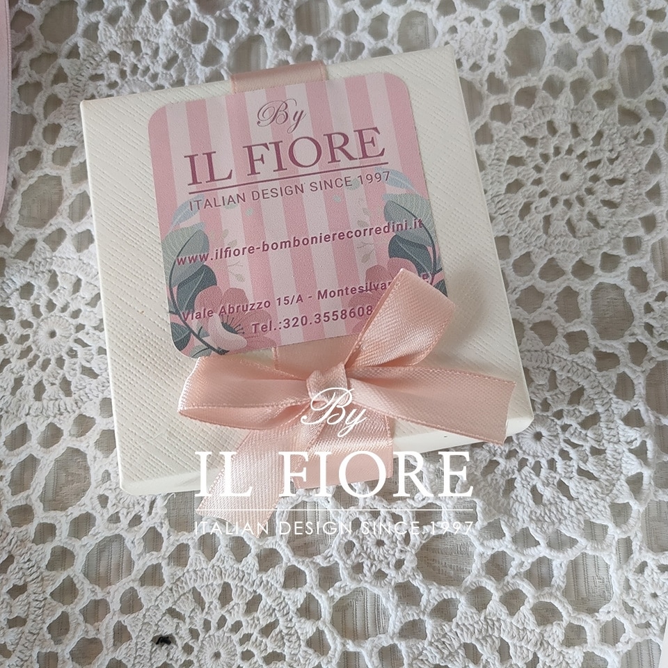 Misura cm 9 x 7 con coperchio. Il nastro della confezione è in raso rosa cipria.