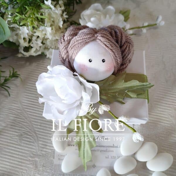 Bomboniera elegantissima scatola portaconfetti con 15 confetti alla mandorla e bigliettino in omaggio, decorata con testa bambolina e fiori ideale per Comunione e Cresima.
