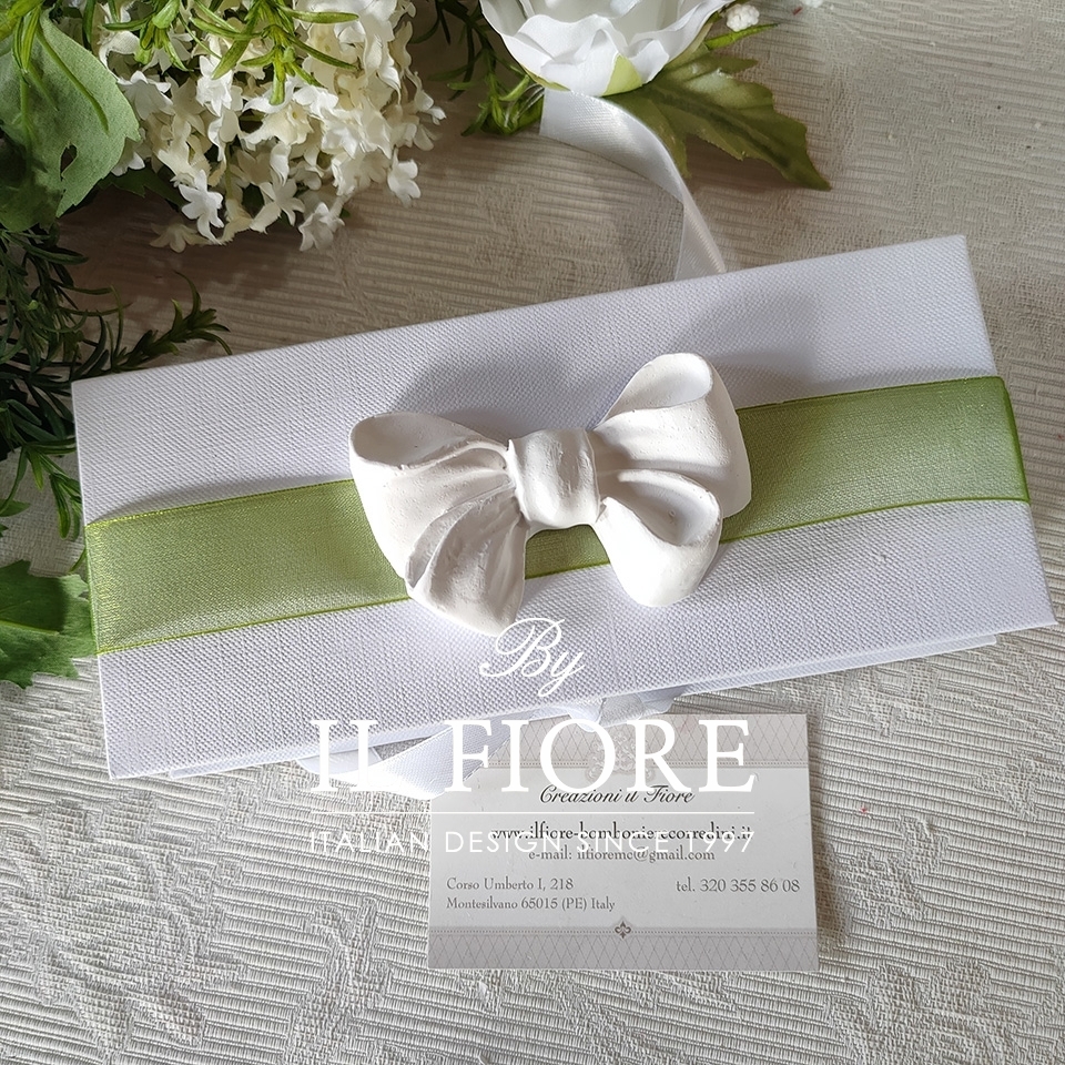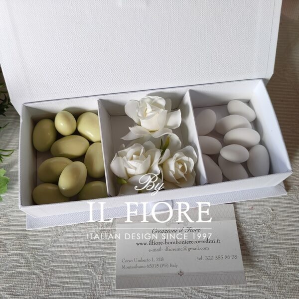 Bomboniera elegantissima scatola portaconfetti con 19 confetti, 9 cioccomandorla al pistacchio e 10 alla mandorla, fiori, bigliettino in omaggio e decorata con fiocco in gesso profumato ideale per Comunione e Cresima.