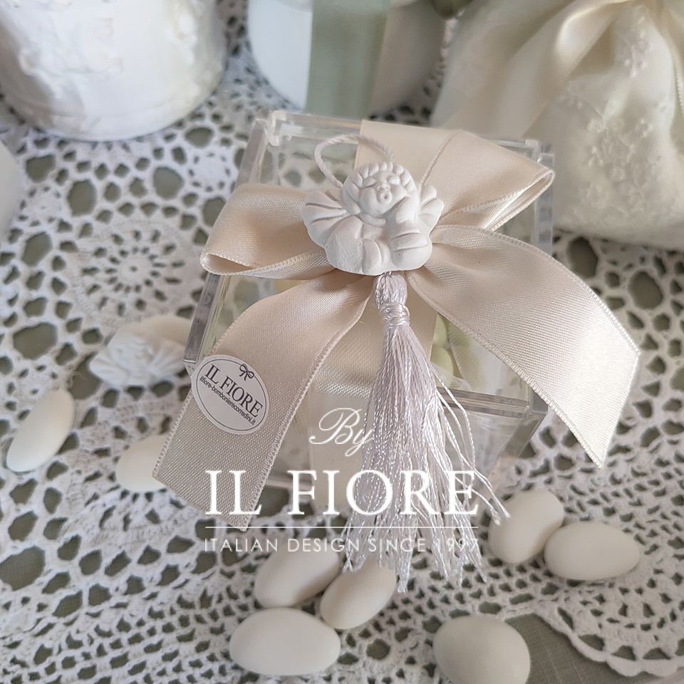 Bomboniera Comunione e Cresima scatola portagioie in plexiglass decorata con angelo e nappina.
