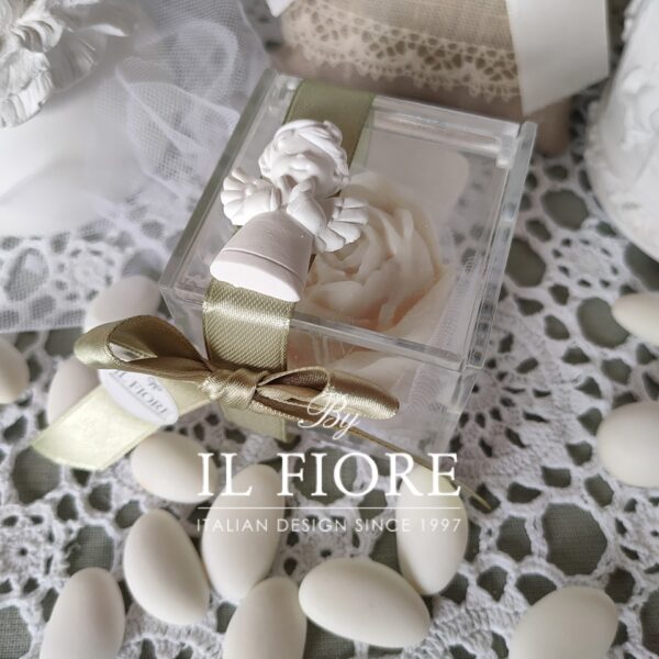 Bomboniera Comunione e Cresima scatola portagioie in plexiglass con candela e decorata con angelo.