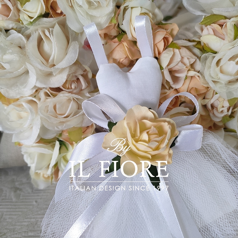 Bomboniera Comunione e Cresima, vestito con tutu e tullè bianco, decorato con nastri di raso e fiore.