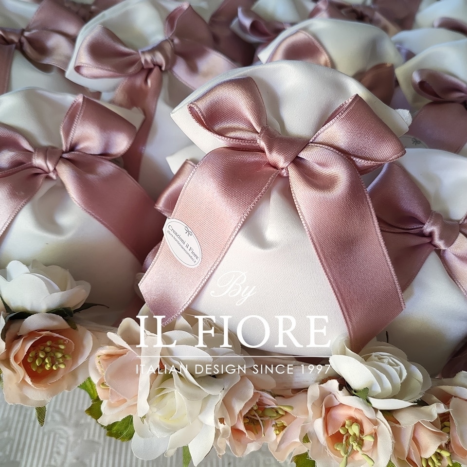 Bomboniera Matrimonio, Comunione, Cresima e anniversario matrimonio, raffinato sacchetto in raso decorato con fiocco di raso rosa antico.