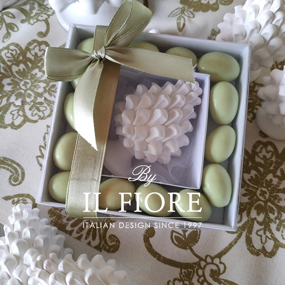Bomboniera Comunione e Cresima, scatola portaconfetti quadrata con pigna siciliana in gesso, confetti cioccomandorla al gusto pistacchio e bigliettino in omaggio.
