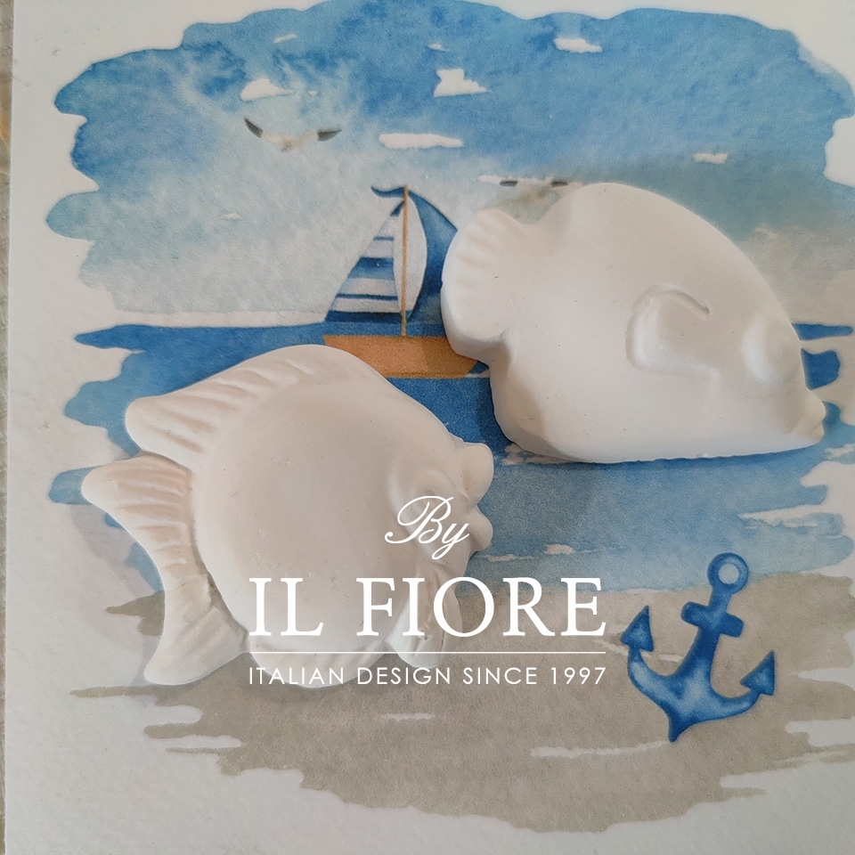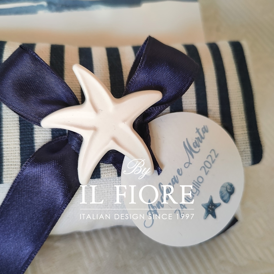 Bomboniera matrimonio, comunione, cresima e anniversario matrimonio, sacchetto portaconfetti bustina  con stella marina, cavalluccio marino, conchiglia e pesciolini in gesso profumato e nastro blu di raso. N.B. La tag non è più disponibile.
