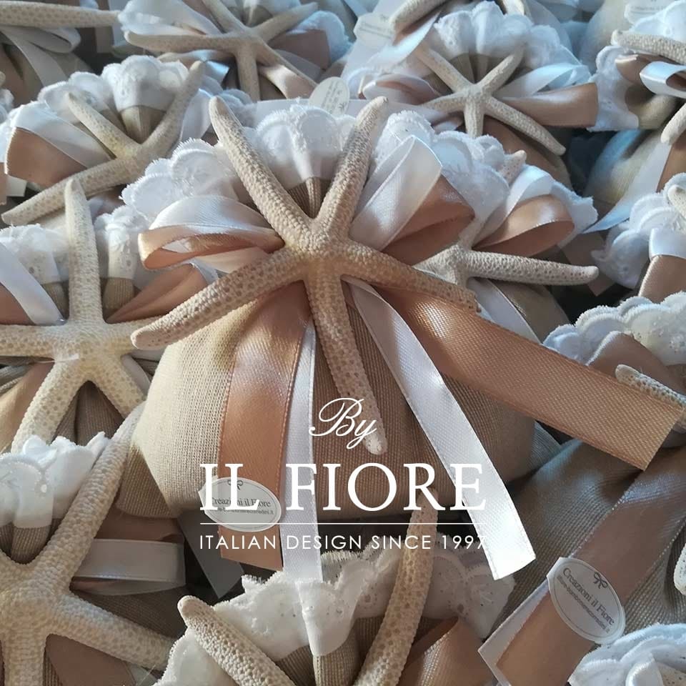 Bomboniera Comunione, Cresima, sacchetto con merletto in san gallo. Nastri avorio e tortora e Stella Marina in gesso BIANCA.
