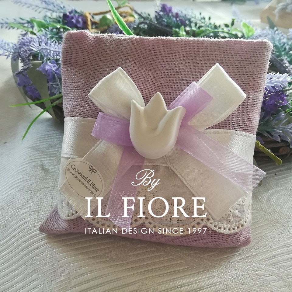 Bomboniera Comunione, Cresima, matrimonio e anniversario matrimonio, sacchetto portaconfetti provenzale decorata con gessetto profumato, San Gallo, nastro in organza colore glicine e nastro di raso.