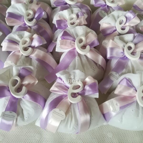 Bomboniere Comunione sacchetto Sangallo con lettera in gesso profumato.
