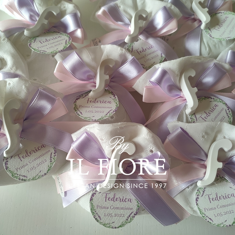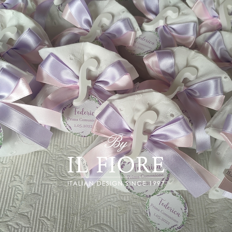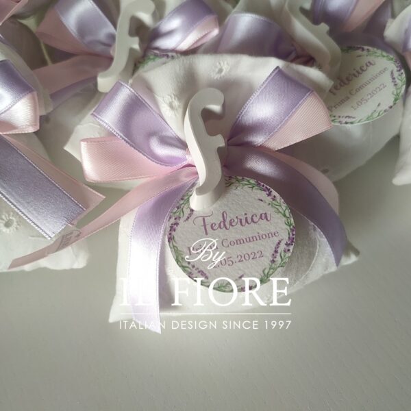 Bomboniere Comunione sacchetto Sangallo con lettera in gesso profumato.