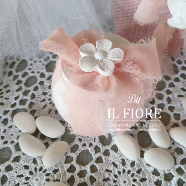 Bomboniera matrimonio, scatola in gesso profumatissimo, oltre ad essere un capiente portagioie ha all’interno anche una candela, decorato con fiore e fiocco .