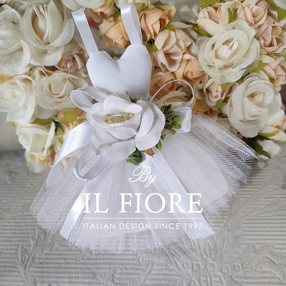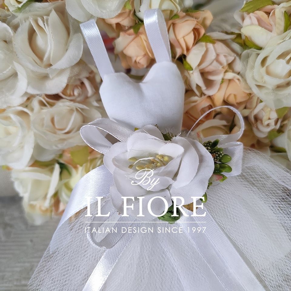 Bomboniera Comunione e Cresima, vestito con tutu e tullè bianco, decorato con nastri di raso e fiori.