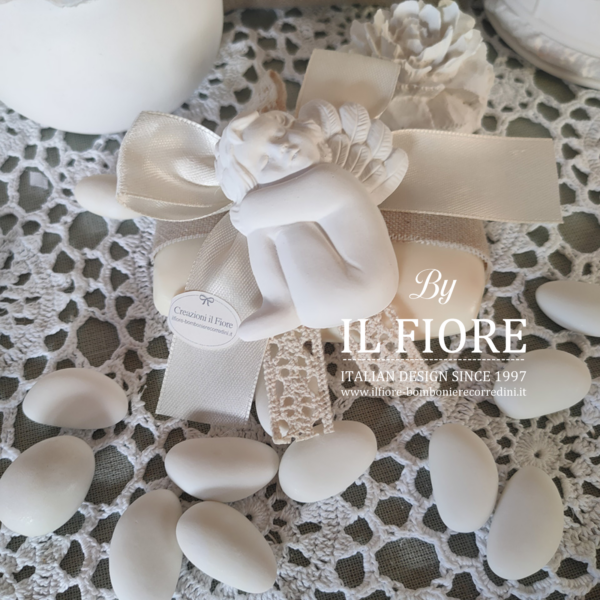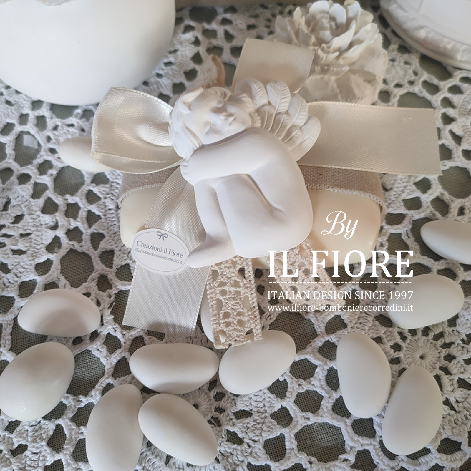 Bomboniera Comunione e Cresima saponetta con angioletto confezionata con scatola e fiocco.