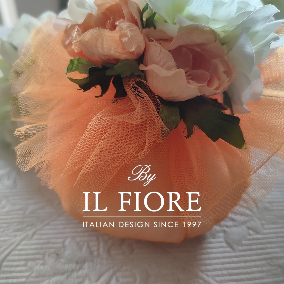 Bomboniera Cresima e Comunione bon bon grande di colore arancio, esclusiva e romantica ricca di fiori. Bomboniera bon bon in tulle profumatissima con potpourri e nastro di raso.