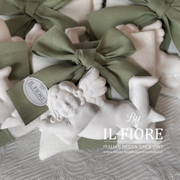Bomboniera Comunione e Cresima, cuscino portaconfetti con angelo in gesso profumato. Il cuscino essendo profumatissimo può essere usato come profumatore di ambiente, confezione con scatola e fiocco.