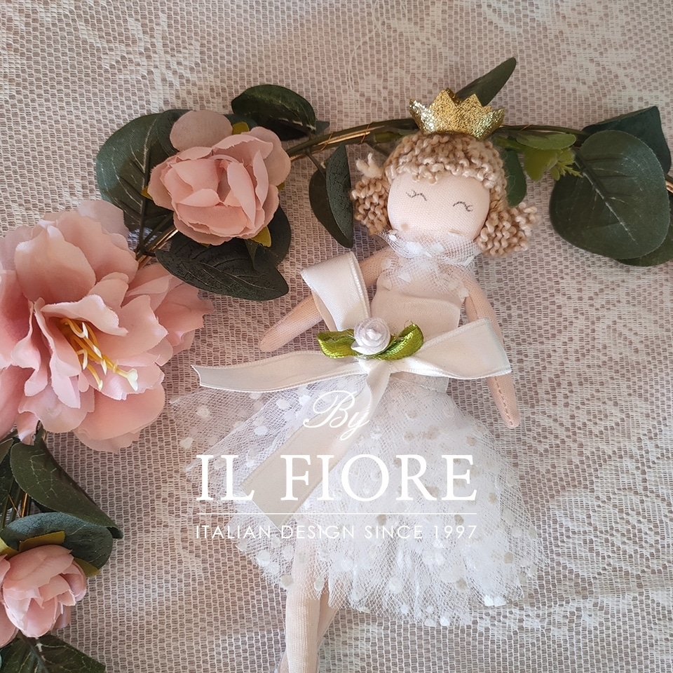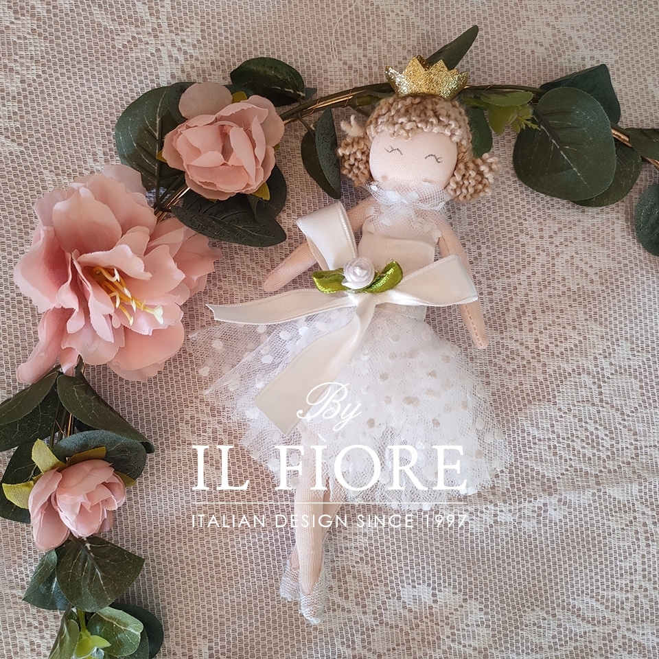 Bomboniera Cresima e Comunione, bambola in stoffa con tutu in tulle a pois e fiore in raso, cm 22.
