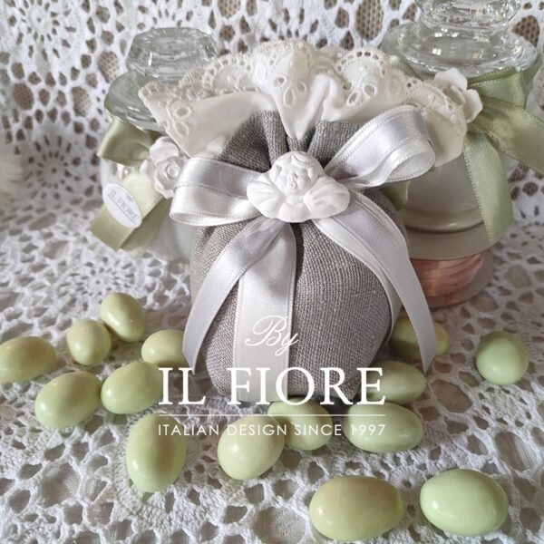 Bomboniera Comunione e Cresima, sacchetto bon bon in lino con merletto in Sangallo e angelo in gesso profumato e nastri.