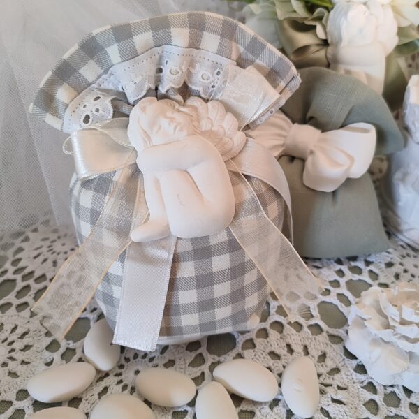Bomboniera Comunione e Cresima, sacchetto a quadri con merletto in Sangallo, angelo in gesso profumato e nastri.