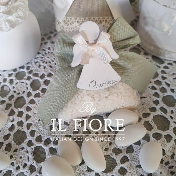 Bomboniera Comunione e Cresima, sacchetto con scaglie di sapone e angioletto con calamita.