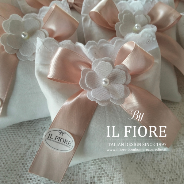 Bomboniera Cresima e Comunione, sacchetto con pizzo Sangallo con fiore, decorato con fiocco di raso .