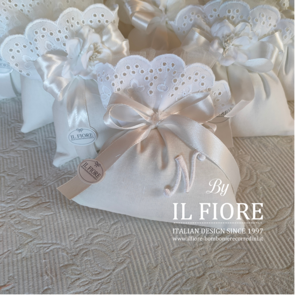 Bomboniera Comunione e Cresima, sacchetto con merletto in Sangallo e personalizzato con lettera.