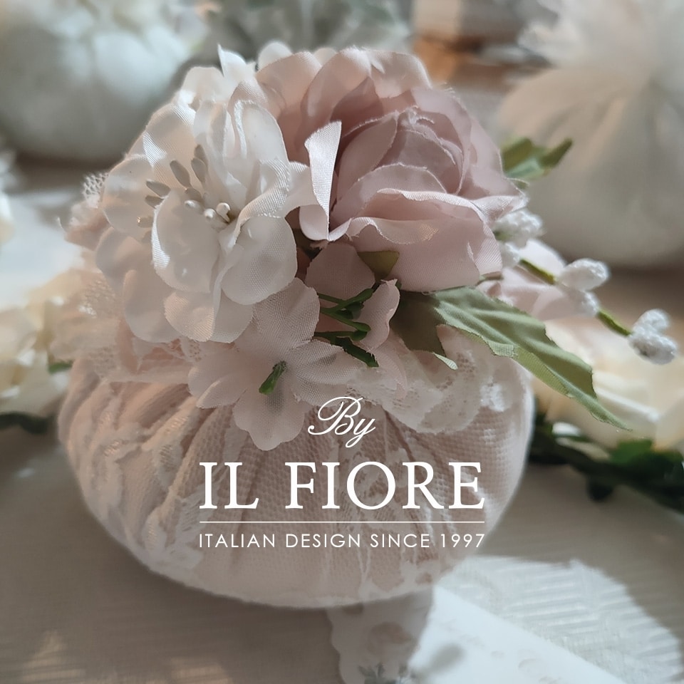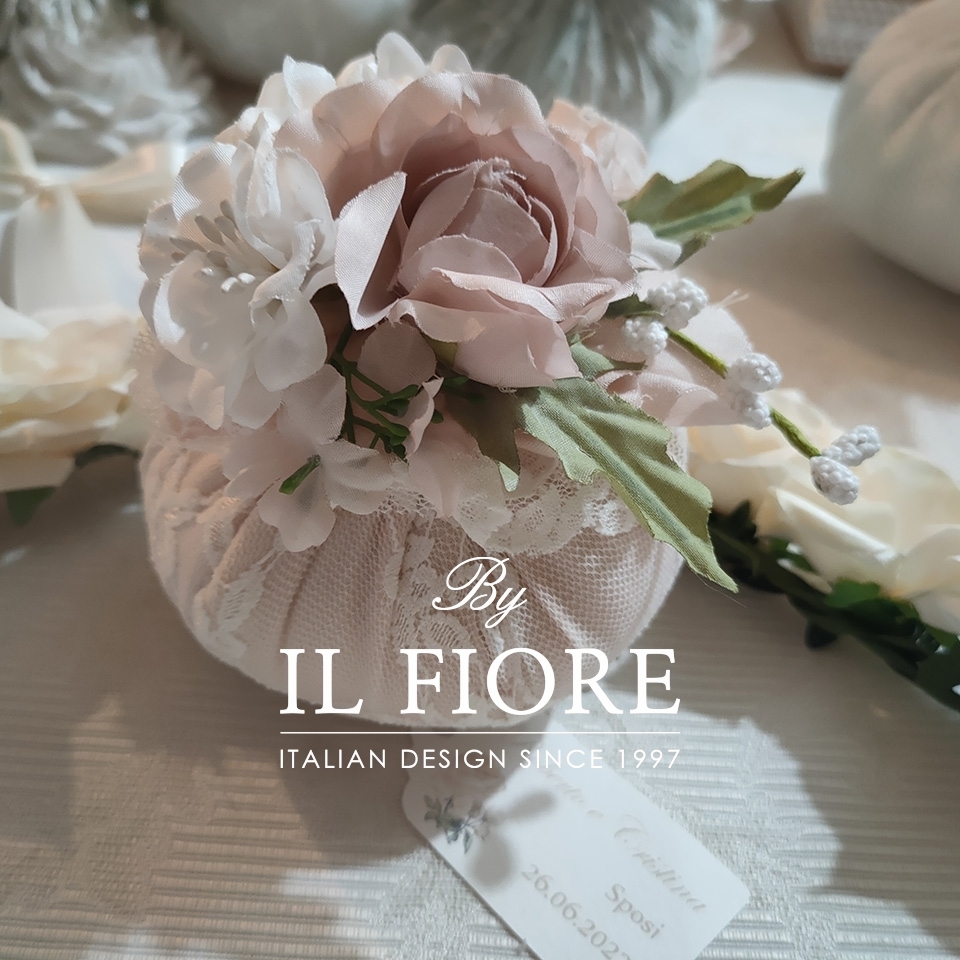Bomboniera bon bon in pizzo bianco e rosa cipria, esclusiva, romantica ricca di fiori e con pot pourri profumatissimo. Una realizzazione elegante, originale, esclusiva e profumata.