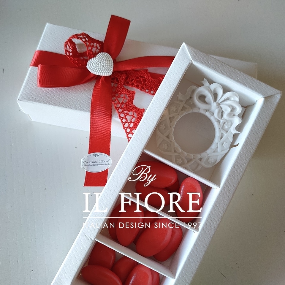 Bomboniera Laurea e Cresima scatola porta confetti con 15 confetti alla mandorla e cornice in gesso cm 6 e biglietto in omaggio. La scatola fuori è decorata con nastro di raso e merletto e cuori in gesso in cinque modelli.