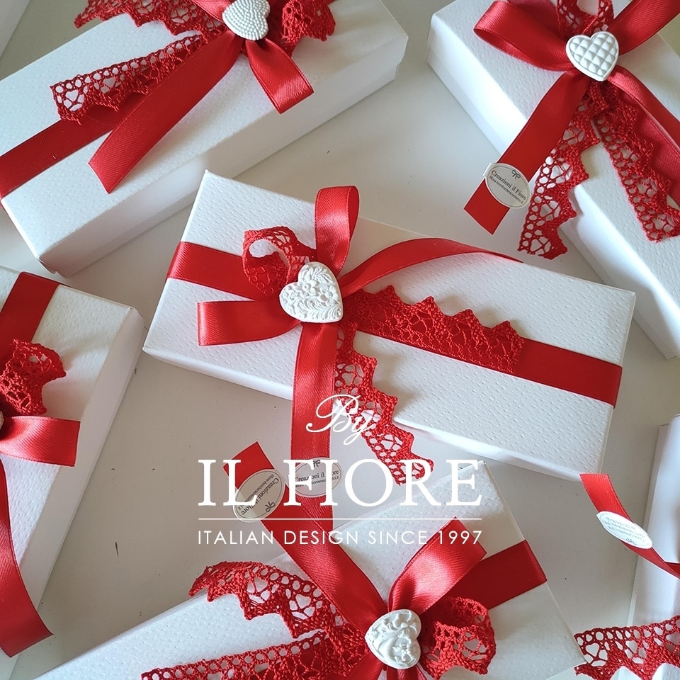 Bomboniera Laurea e Cresima scatola porta confetti con 25 confetti alla mandorla e biglietto in omaggio. La scatola fuori è decorata con nastro di raso e merletto e cuori in gesso in cinque modelli.