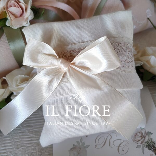 Bomboniera matrimonio busta con pizzo e fiocco di raso.